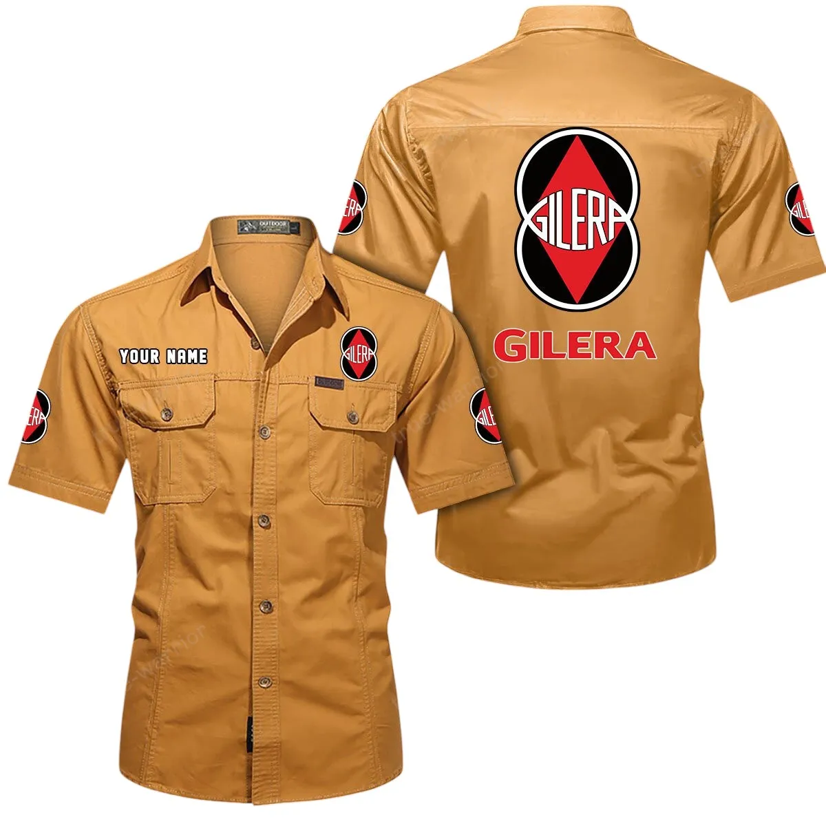 Gilera Motorcycles Short Sleeved Shirt, All Over Print Button Shirt CAR444052625844 - Khaki