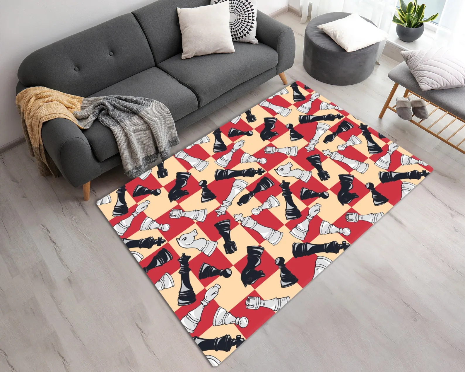 Rug with Red and White Checkered Background and Black and White Chess Pieces CLE05090425000