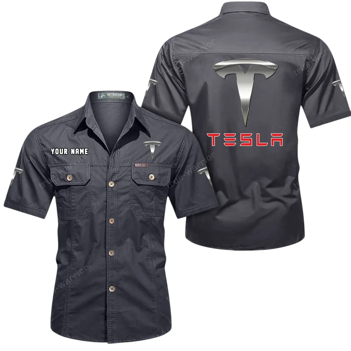 Tesla Short Sleeved Shirt, All Over Print Button Shirt CAR444052625845 - Khaki